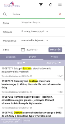 - Dostęp do bazy najaktualniejszych postępowań przetargowych, zapytań ofertowych, zaproszeń do składania ofert, zapytań o cenę a także wyników przetargów