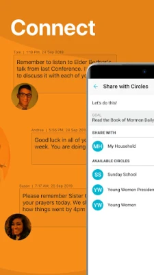 The Circles feature connects you with family, classes, quorums, and others who serve with you in the Church. You can have conversations about group activities, discuss what you are learning, share goal progress, and encourage and support one another. From the Discover feed, content can be shared such as inspirational articles, images, quotes, videos, and ideas for service and group activities. Within Circles, members can create group activities or meetings and invite others too events; participants can RSVP indicating participation.