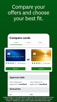 † Approval Odds are not a guarantee of approval. Credit Karma determines Approval Odds by comparing your credit profile to other Credit Karma members who were approved for the personal loan, or whether you meet certain criteria determined by the lender. Of course, there's no such thing as a sure thing, but knowing your Approval Odds may help you narrow down your choices. For example, you may not be approved because you don't meet the lender's "ability to pay standard" after they verify your income and employment; or, you already have the maximum number of accounts with that specific lender.